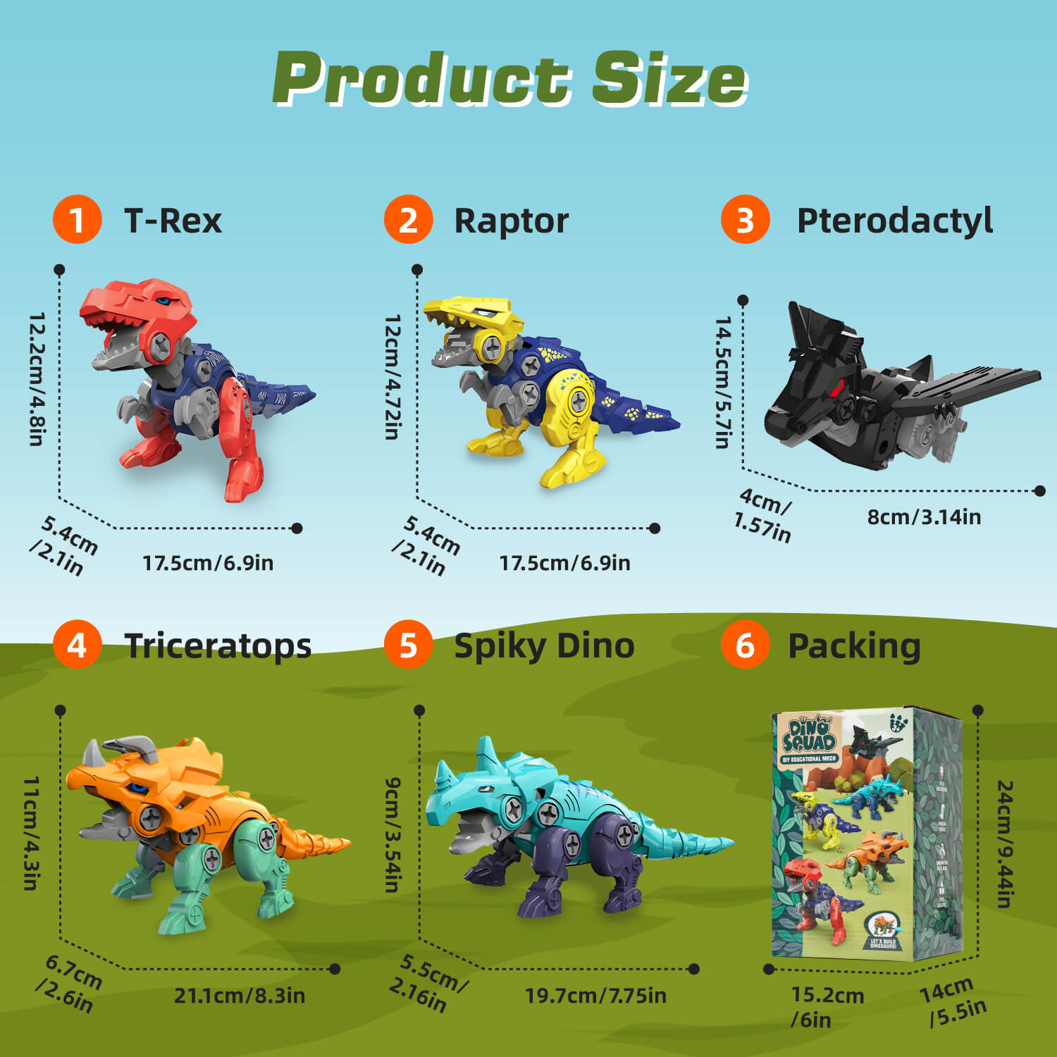 - Funny & Educational: Our creative building dinosaur toys for boys 3+ years old comes with 5 dinosaurs - T-Rex , Velociraptor, Triceratops, Pterosaur, Monoclonius. This set of take aparts dinosaur toys can stimulate kid's curiosity and creativity, and develop their fine operation skills and problem-solving ability. They will also have a lot of fun in the process.