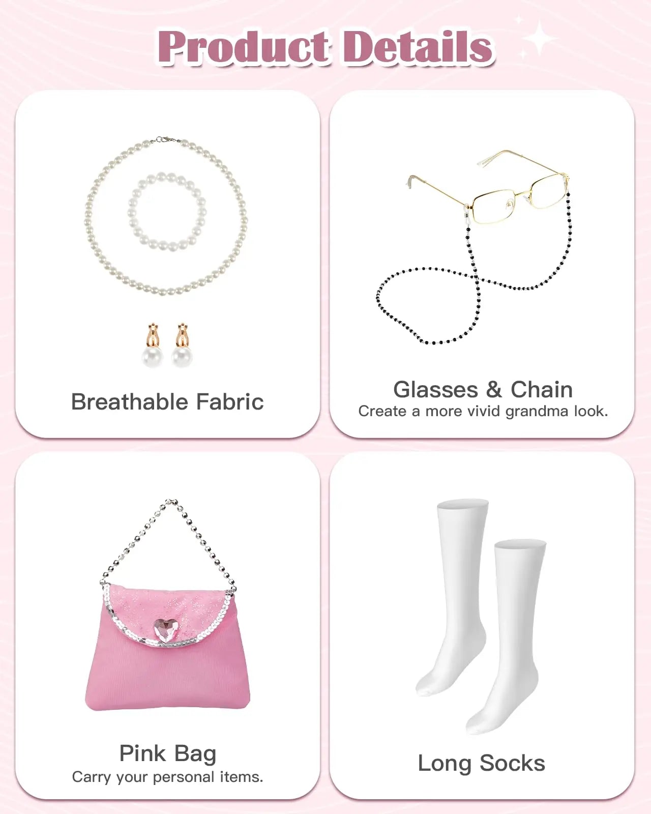 - Charming Jewelry & Accessories: This old lady costume includes stylish glasses, a lovely necklace, a matching bracelet, elegant ear cuffs, a pink bag for added flair, and cozy long socks, creating a complete and charming old lady look for your child.