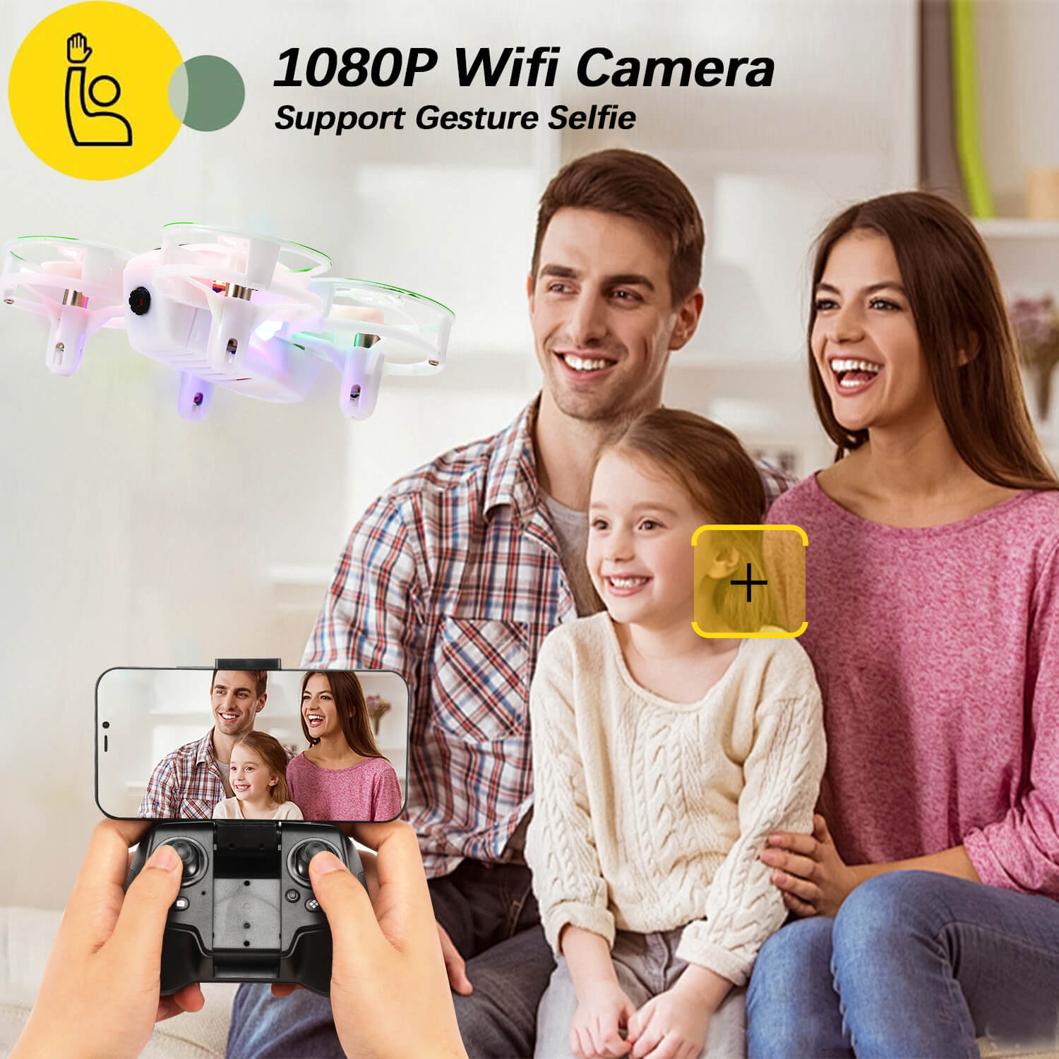 This mini drone equipped with a 720p 0-90° adjustable angle lens, allows you to take wider landscape photos and videos during the flight. Connect to the drone in the mobile phone APP to view the real-time pictures taken by the drone, experience the fun of First Person View flying perspective.
