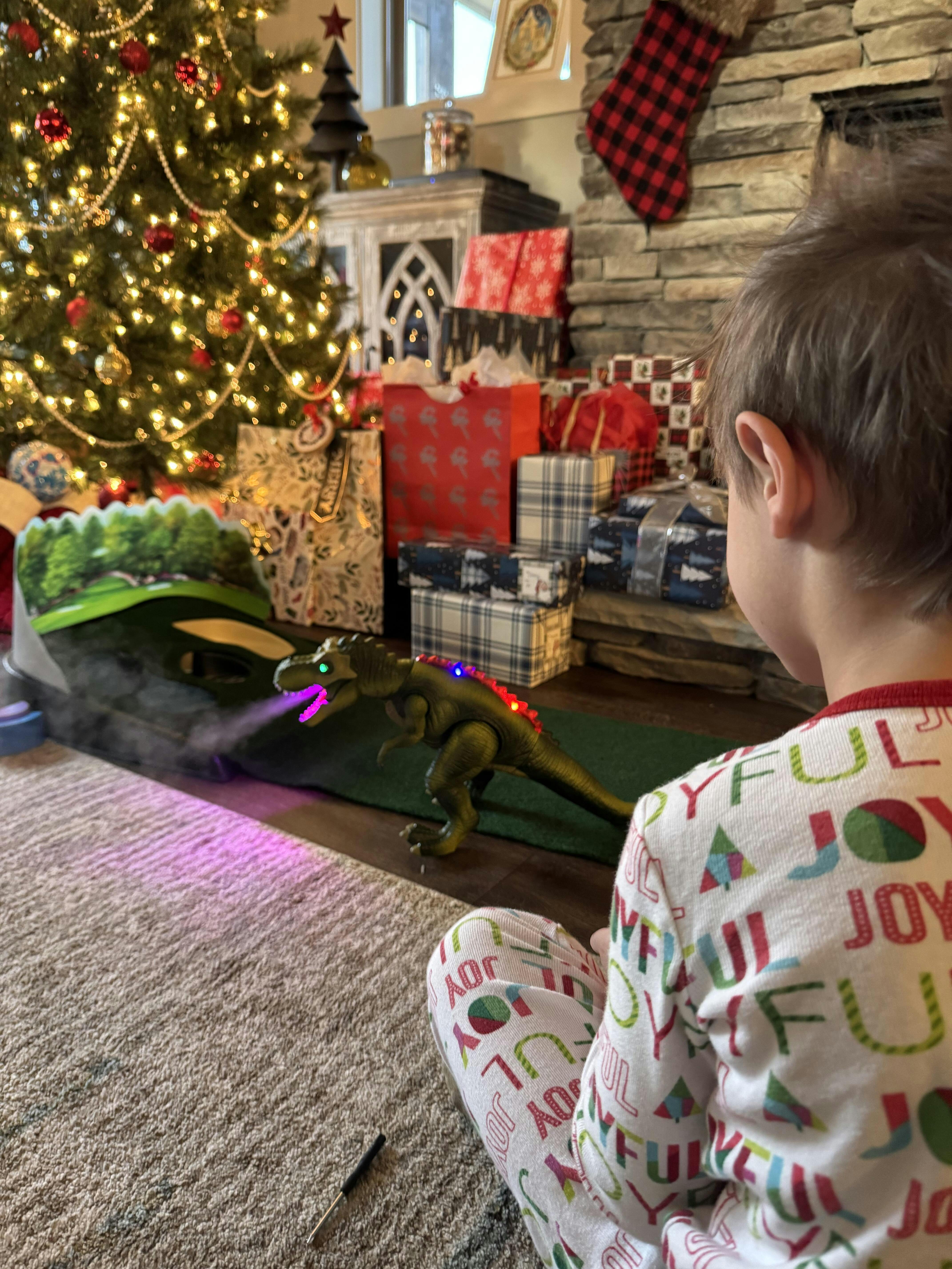 Our remote control dinosaur toy is perfect for kids who love Jurassic-themed fun. This large T-Rex toy, equipped with multiple features and a 5-button remote control, includes one Light-up T-Rex four small dinosaurs. It breathes steam, lights up, and growls when you add water and press the spray switch, mimicking a real T-Rex. T-Rex rc dinosaur can walk, turn its head, light up, spray mist, and play music.Best of all, bright color-changing LED lights add visual excitement.Made from durable, non-toxic ABS material, it's safe for kids and built to last. Easy to set up with 3 AA batteries, this toy makes an excellent gift for Christmas and New Year, offering endless entertainment and bonding opportunities for children and their families.